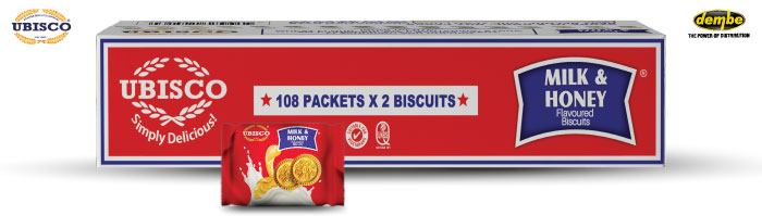NEW & IMPROVED! Try the all new UBISCO Milk & Honey® Flavored Biscuits Boxed range. Available in cartons of 108 packets x 2 biscuits.